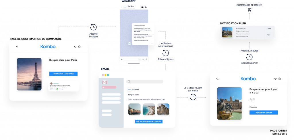 Utilisez les notifications Web Push, WhatsApp, les e-mails et les SMS.