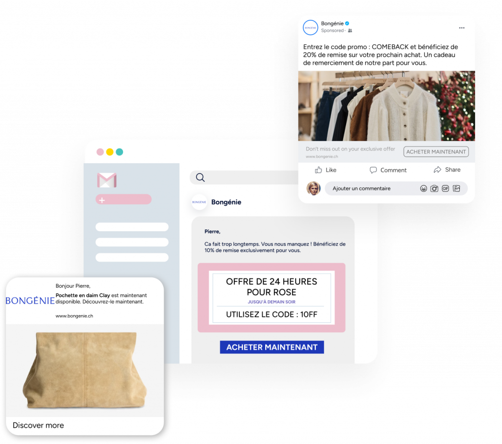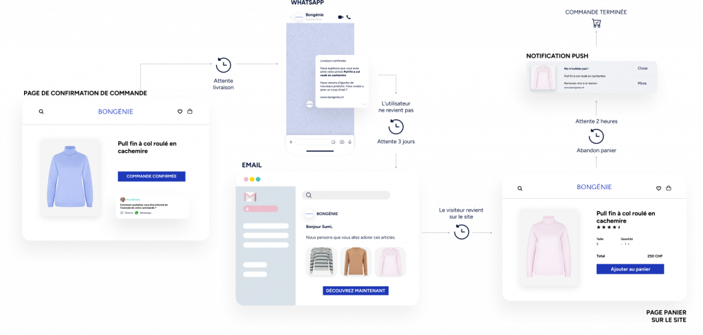 Utilisez les notifications Web Push, WhatsApp, les e-mails et les SMS.
