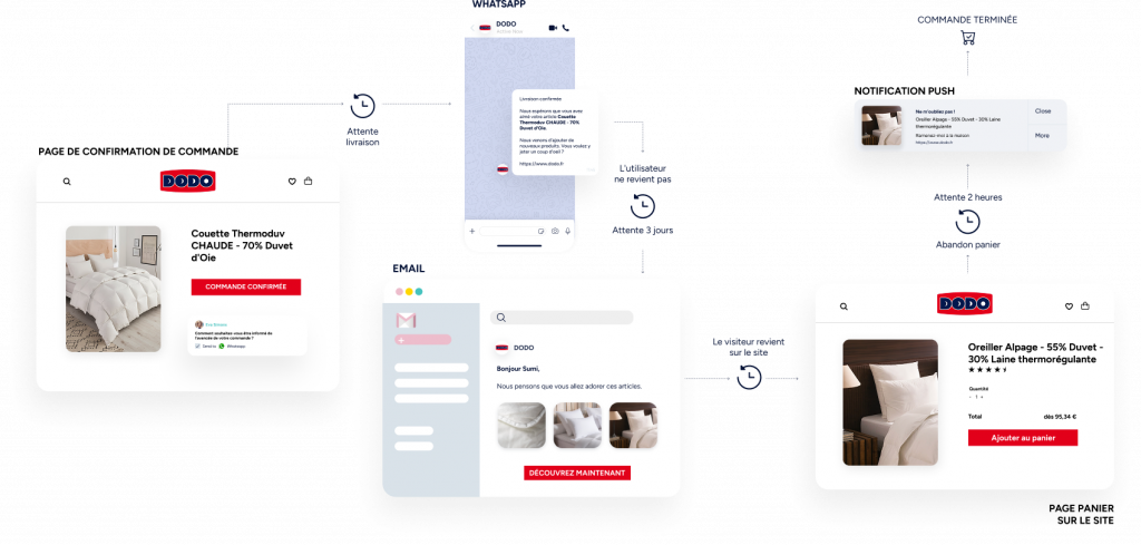 Utilisez les notifications Web Push, WhatsApp, les e-mails et les SMS.