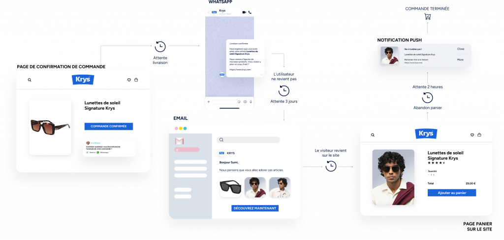 Utilisez les notifications Web Push, WhatsApp, les e-mails et les SMS.