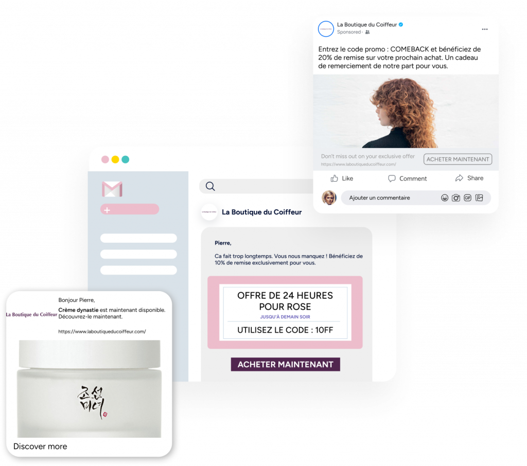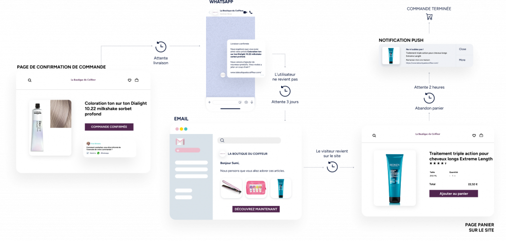 Utilisez les notifications Web Push, WhatsApp, les e-mails, et les SMS.