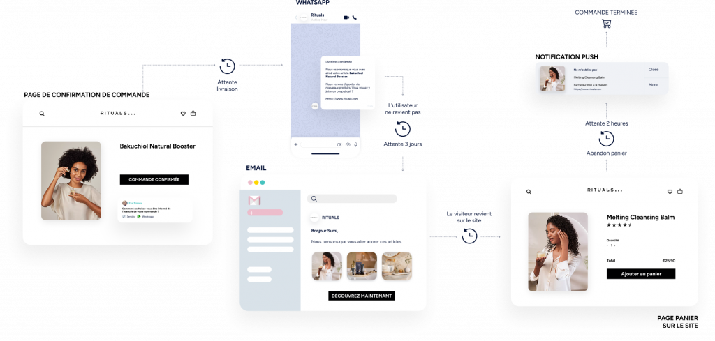 Utilisez les notifications Web Push, WhatsApp, les e-mails, et les SMS.