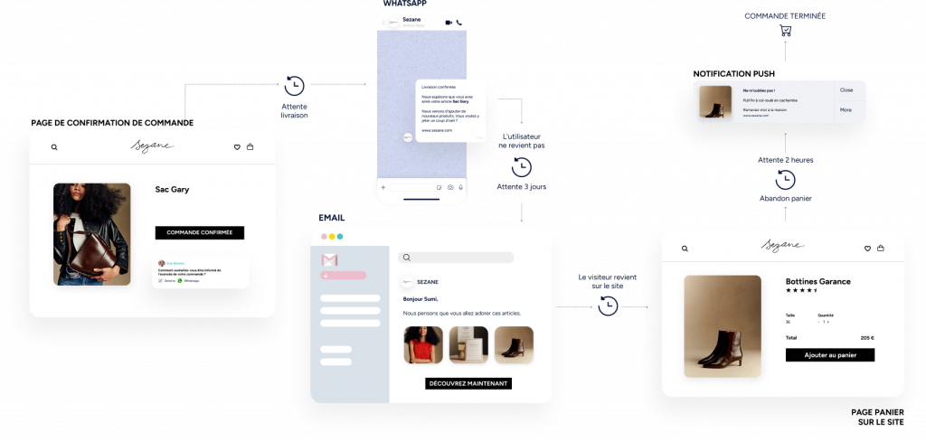 Utilisez les notifications Web Push, WhatsApp, les e-mails et les SMS.