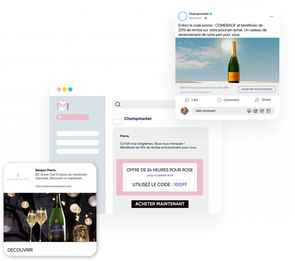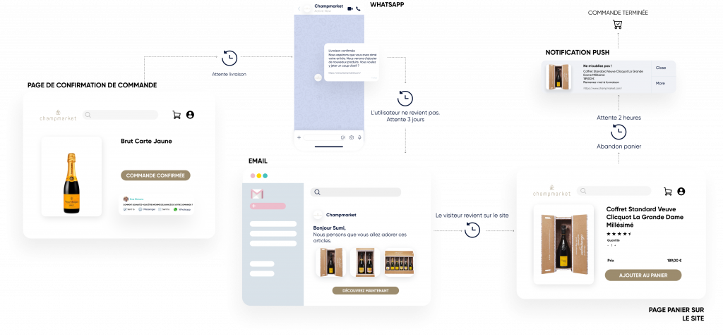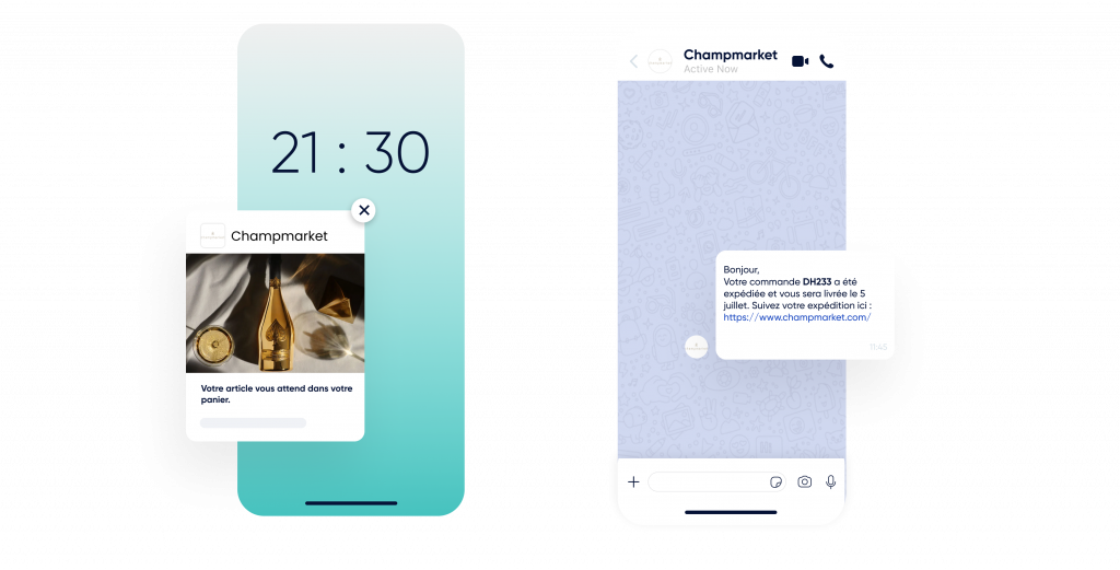 Utilisez les notifications Web Push, WhatsApp, les e-mails et les SMS.