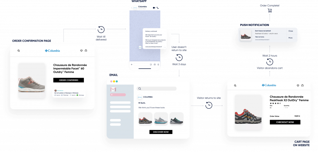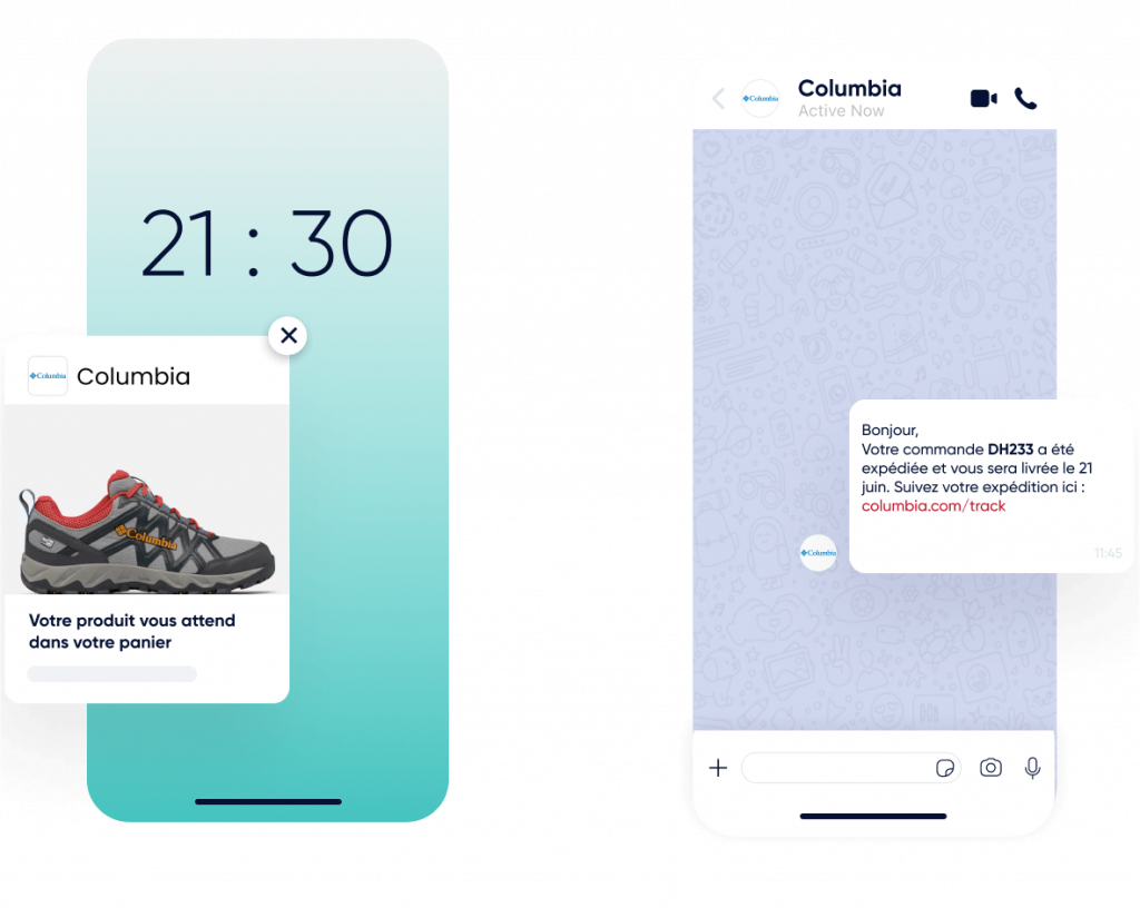 Utilisez les notifications Web Push, WhatsApp, les e-mails, les SMS et le RCS.