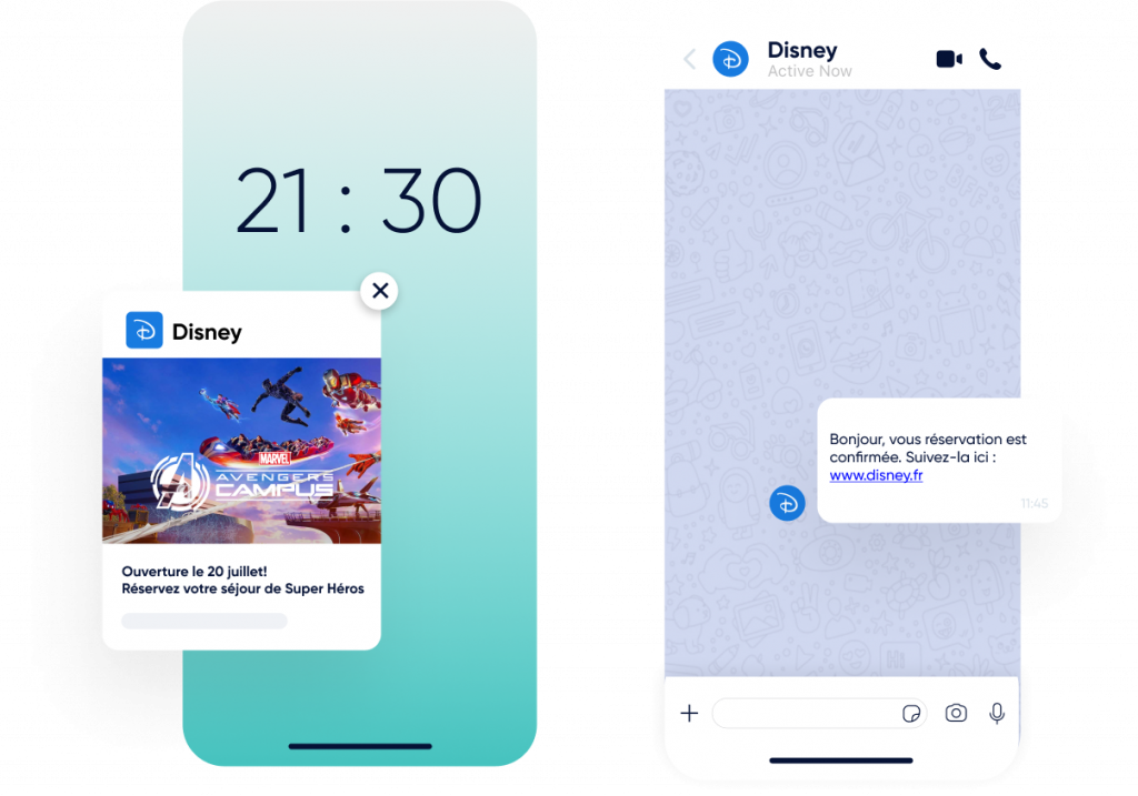Utilisez les notifications Web Push, WhatsApp, les e-mails, les SMS et le RCS.