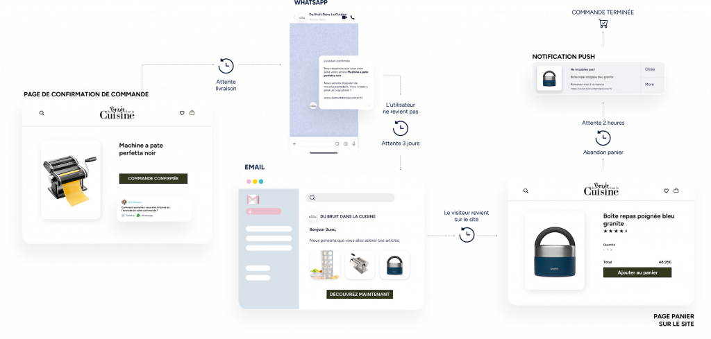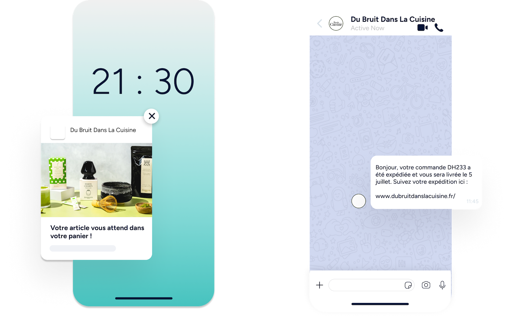 Utilisez les notifications Web Push, WhatsApp, email, et SMS. Envoyez des alertes automatiques et des messages personnalisés, comme des rappels de panier abandonné ou de retour en stock, pour accélérer les décisions d’achat et récupérer des ventes perdues.
