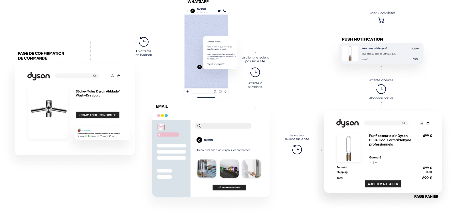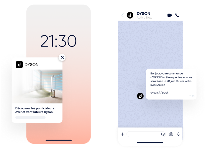 Utilisez les notifications Web Push, WhatsApp, les e-mails, les SMS et le RCS.