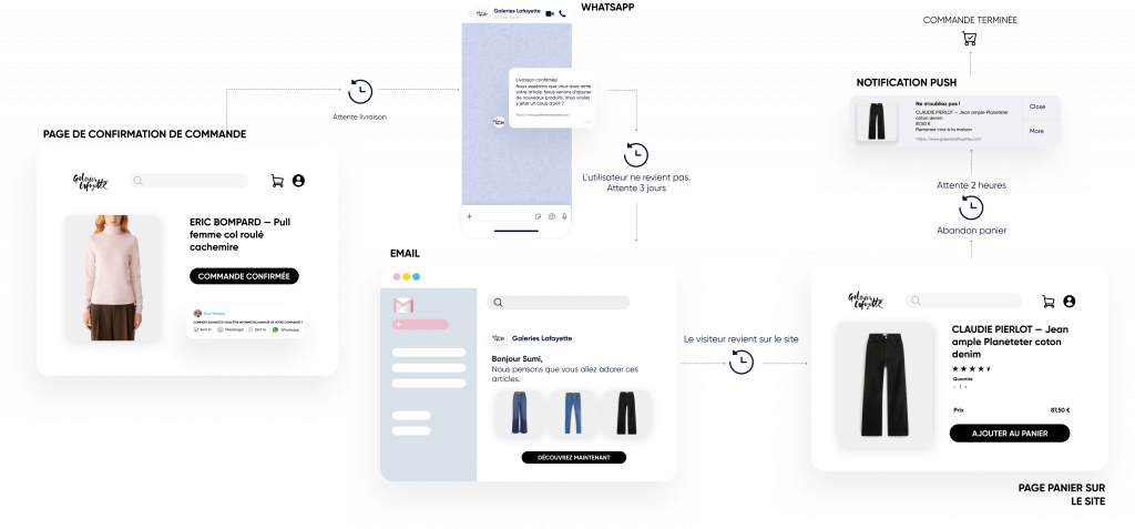Utilisez les notifications Web Push, WhatsApp, les e-mails et les SMS.