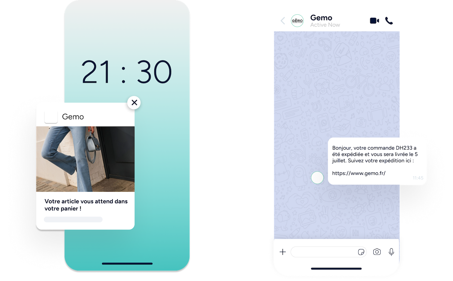 Utilisez les notifications Web Push, WhatsApp, email, et SMS. Envoyez des alertes automatiques et des messages personnalisés, comme des rappels de panier abandonné ou de retour en stock, pour accélérer les décisions d’achat et récupérer des ventes perdues.