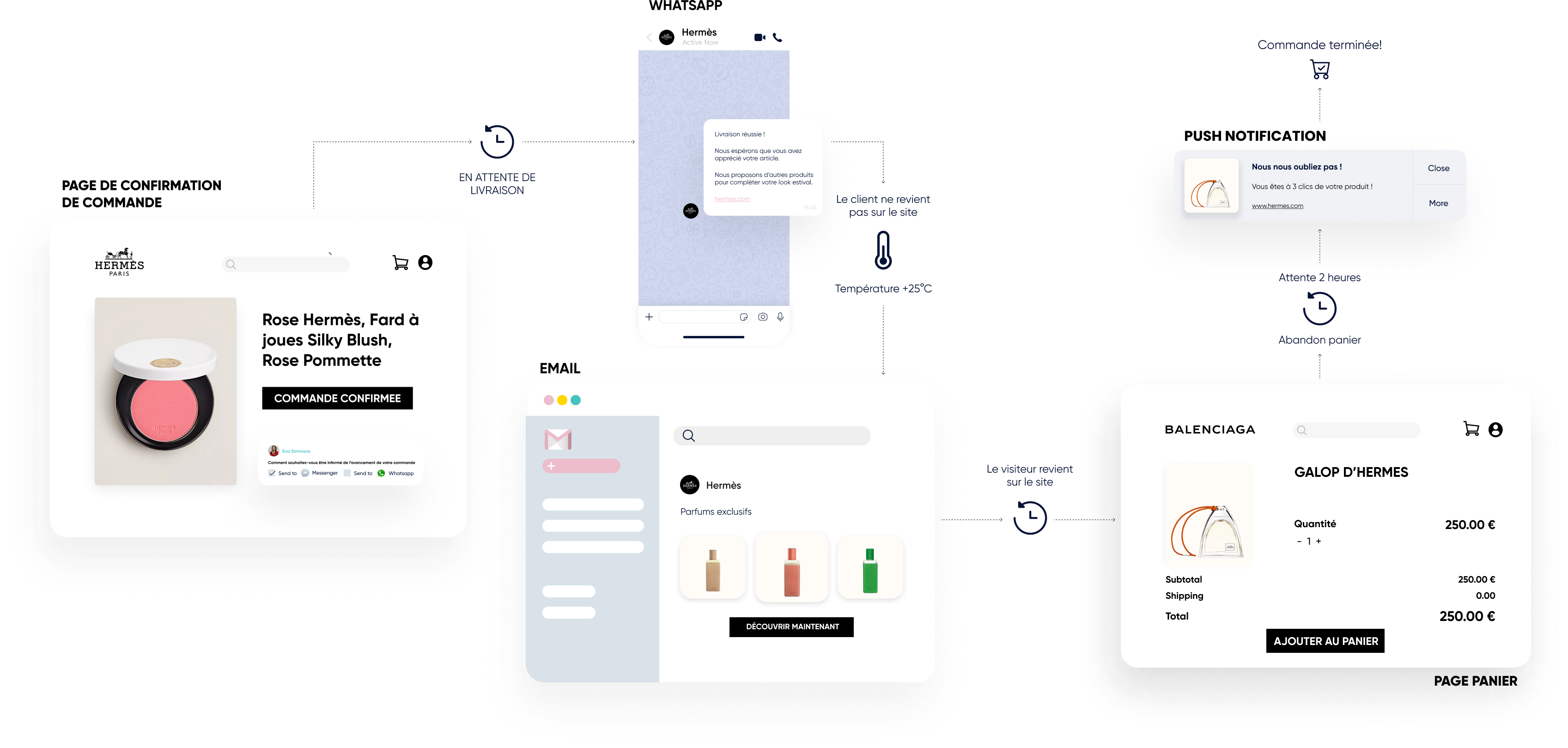 Utilisez les notifications Web Push, WhatsApp, les e-mails, et les SMS.