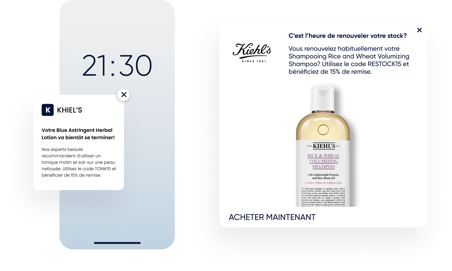 Envoyez à vos clients des rappels de replenishment onsite and offsite pour les inciter à revenir sur votre site, juste avant que leur produit préféré ne soit épuisé.
