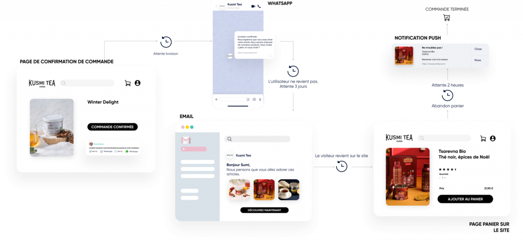 Utilisez les notifications Web Push, WhatsApp, les e-mails, et les SMS.