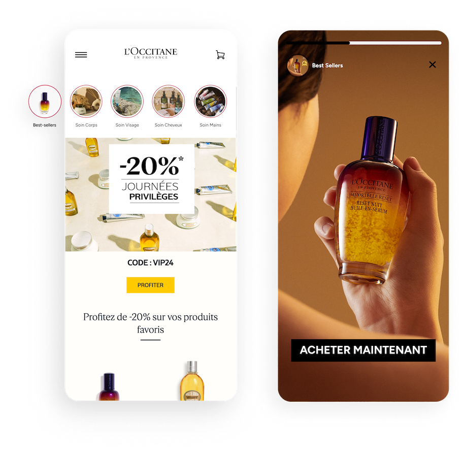 Augmentez la visibilité et améliorez la découverte de vos produits grâce à la navigation, comme sur les réseaux sociaux. Avec InStory, vous pouvez personnaliser les histoires en fonction des intérêts ou du comportement des utilisateurs ; vos images se transforment en une expérience immersive que vos clients vont adorer.