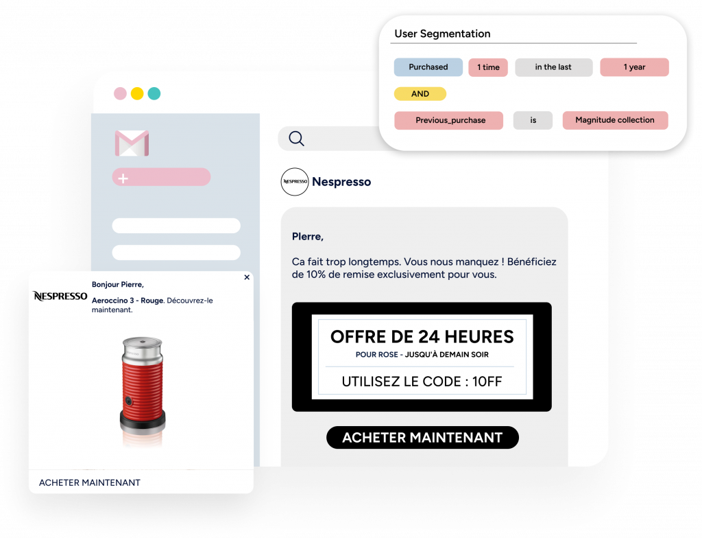 Utilisez les notifications Web Push, WhatsApp, email, et SMS. Envoyez des alertes automatiques et des messages personnalisés, comme des rappels de panier abandonné ou de retour en stock, pour accélérer les décisions d’achat et récupérer des ventes perdues.
