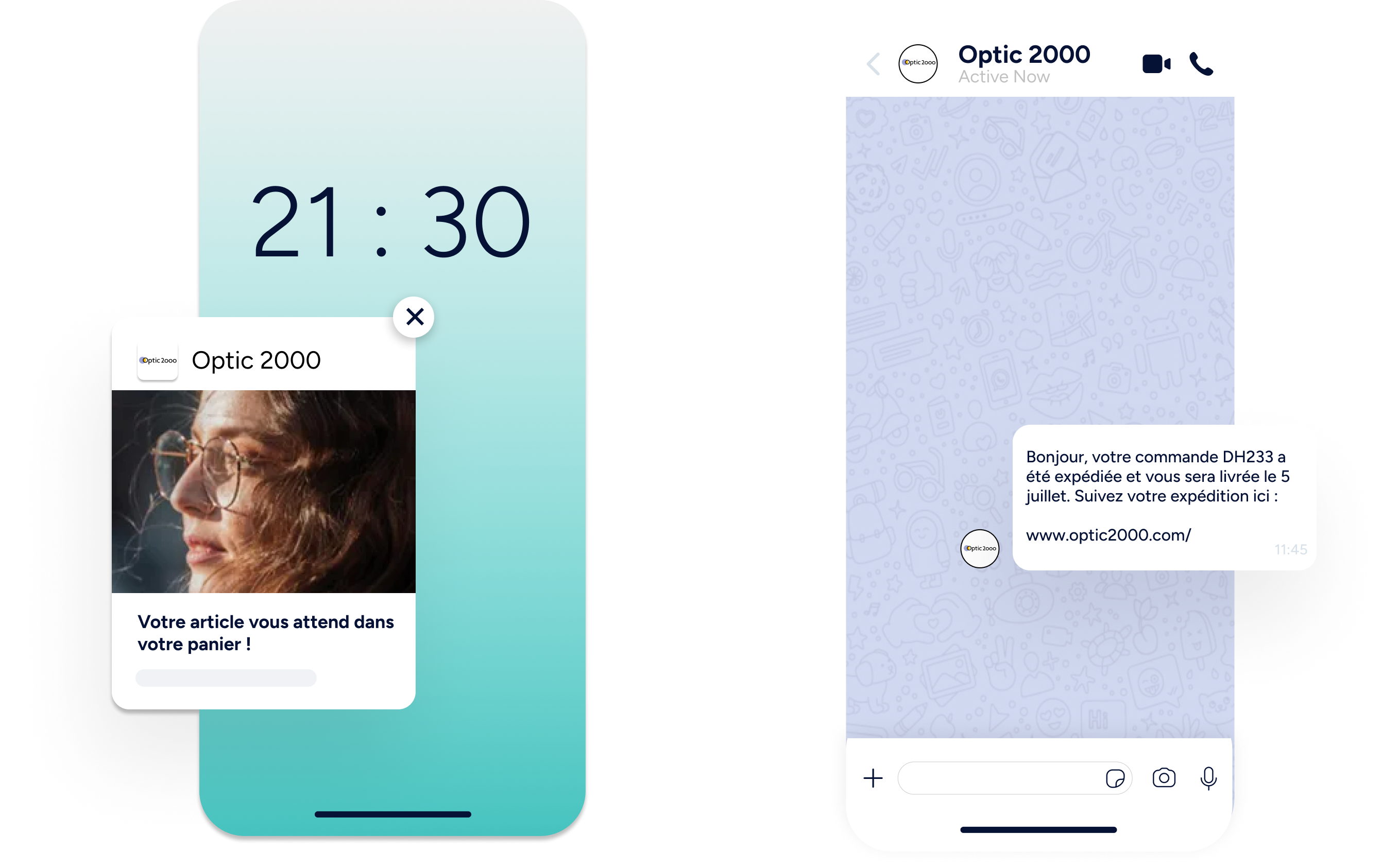 Utilisez les notifications Web Push, WhatsApp, email, et SMS. Envoyez des alertes automatiques et des messages personnalisés, comme des rappels de panier abandonné ou de retour en stock, pour accélérer les décisions d’achat et récupérer des ventes perdues.