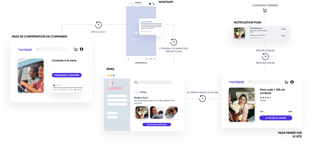 Utilisez les notifications Web Push, WhatsApp, les e-mails et les SMS.