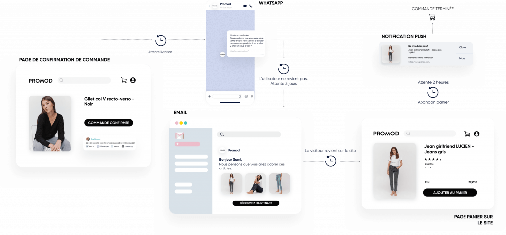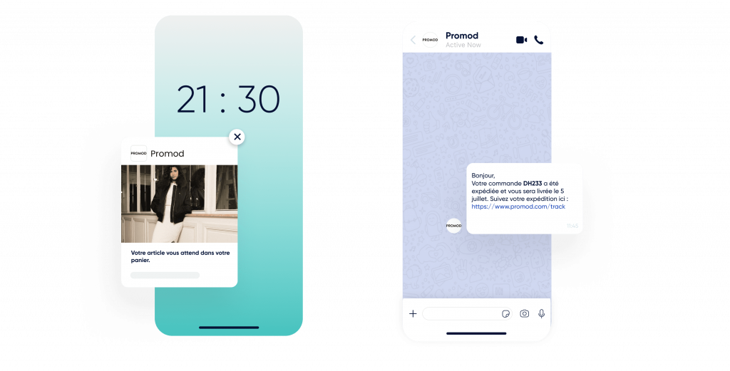 Utilisez les notifications Web Push, WhatsApp, les e-mails et les SMS.