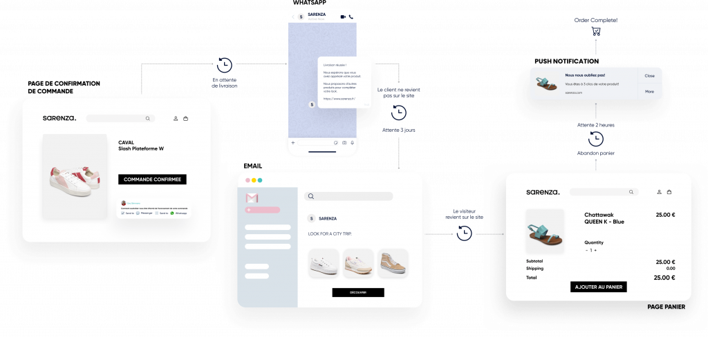 Utilisez les notifications Web Push, WhatsApp, les e-mails, les SMS.