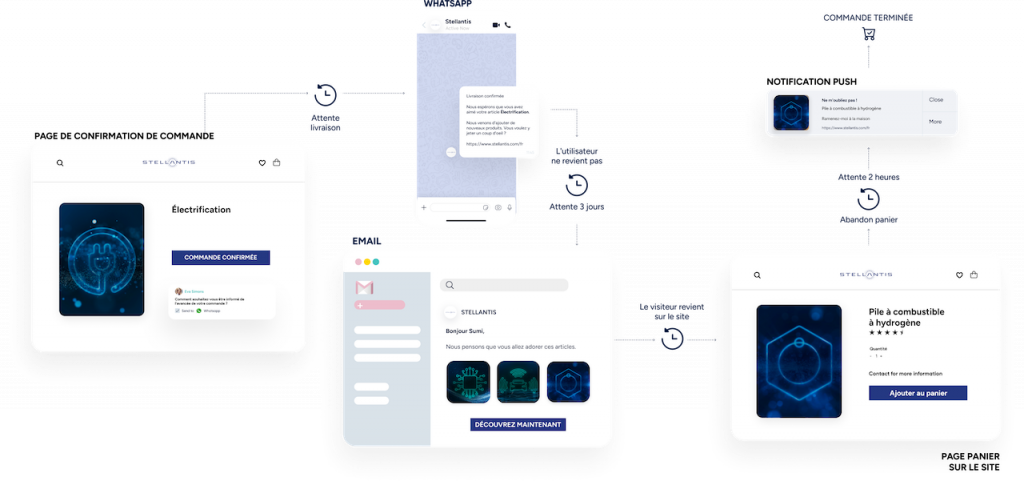 Utilisez les notifications Web Push, WhatsApp, les e-mails, et les SMS.