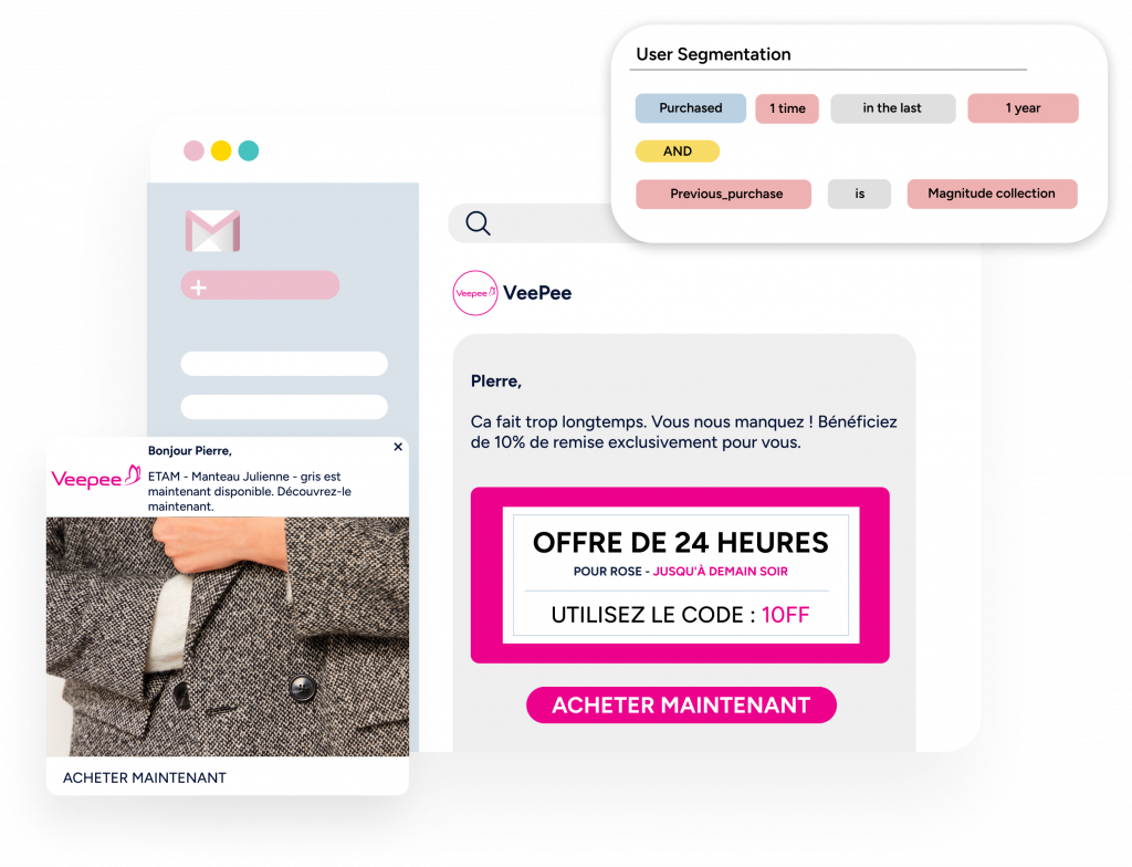 Utilisez les notifications Web Push, WhatsApp, email, et SMS. Envoyez des alertes automatiques et des messages personnalisés, comme des rappels de panier abandonné ou de retour en stock, pour accélérer les décisions d’achat et récupérer des ventes perdues.