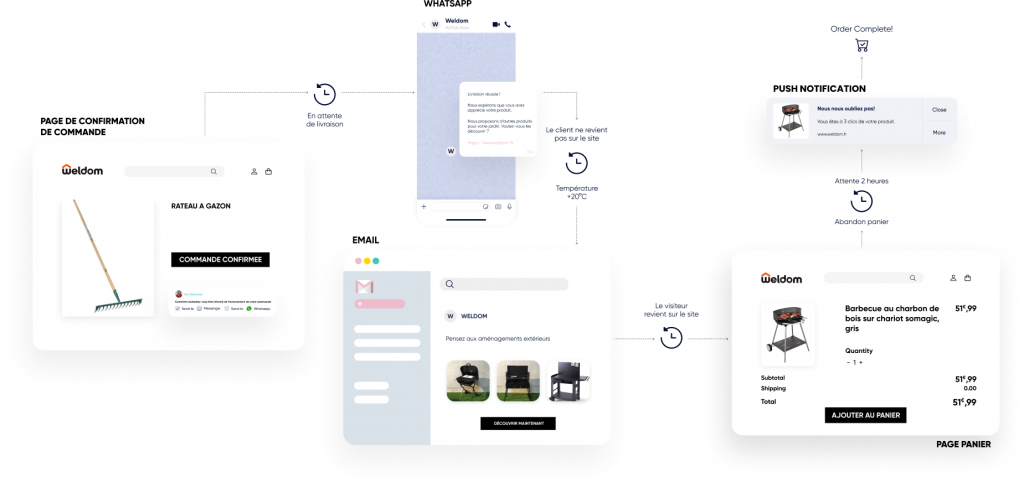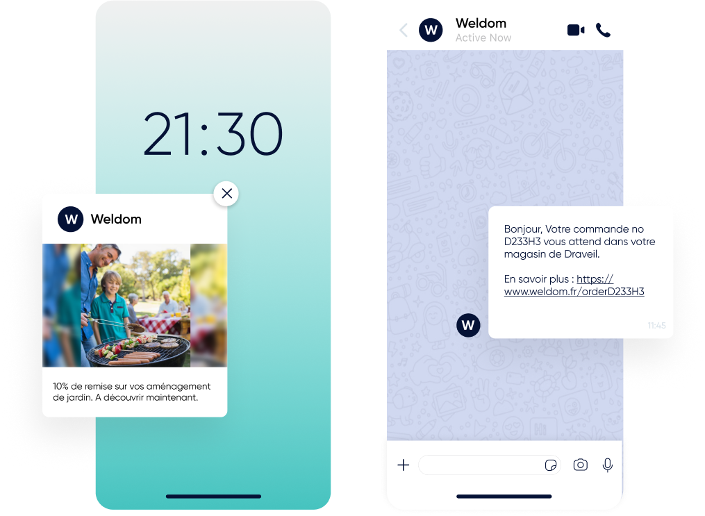Utilisez les notifications Web Push, WhatsApp, les e-mails, les SMS.