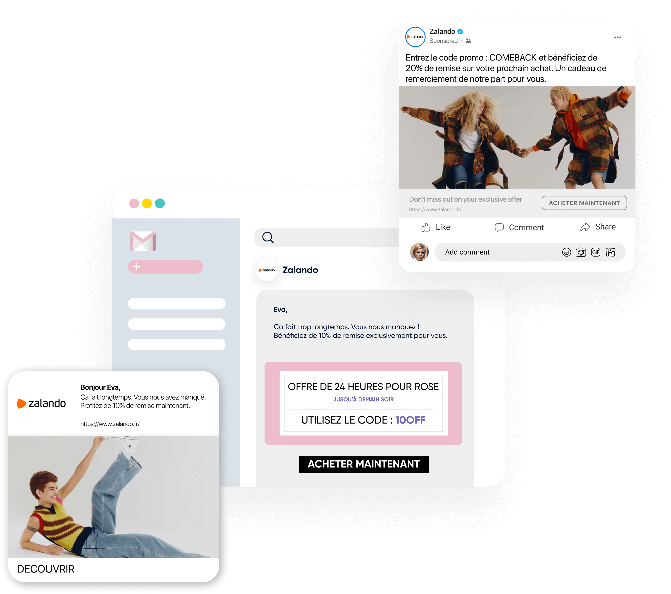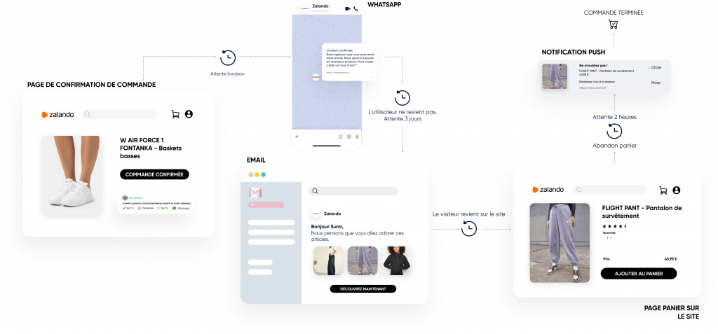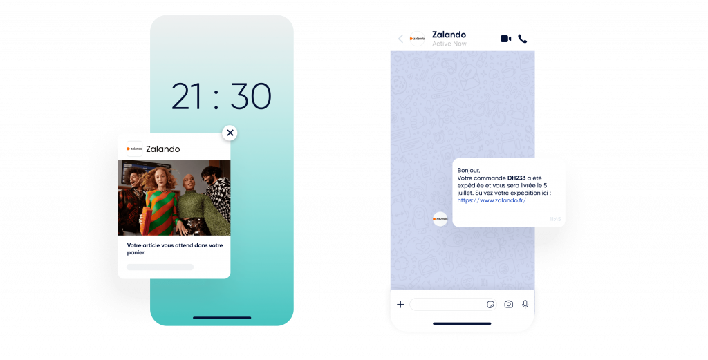 Utilisez les notifications Web Push, WhatsApp, les e-mails, et les SMS.