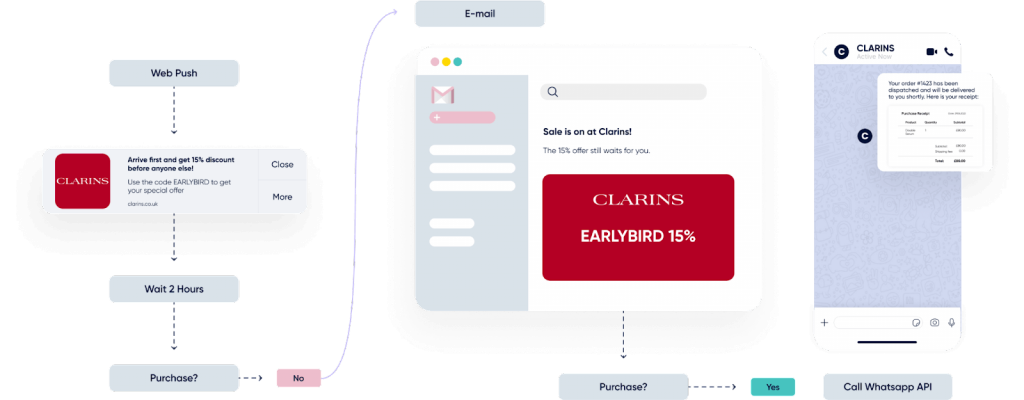 La clé ici est que chaque nouveau message peut prendre en compte la réaction du client au précédent. Cette approche marketing cross-canal garantit que vos messages et votre image de marque sont toujours cohérents, ce qui génère un engagement plus élevé et plus de conversions.