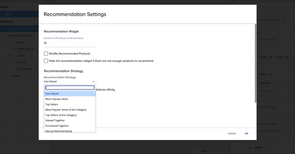 Lorsqu’il s’agit de recommandations produits, vous pouvez laisser le processus entièrement entre les mains de nos algorithmes en choisissant une stratégie de recommandation basée sur l’utilisateur. C’est un excellent moyen d’augmenter facilement l’engagement, les conversions et le chiffre d’affaires, car notre plateforme propose automatiquement des recommandations pertinentes à chaque utilisateur.