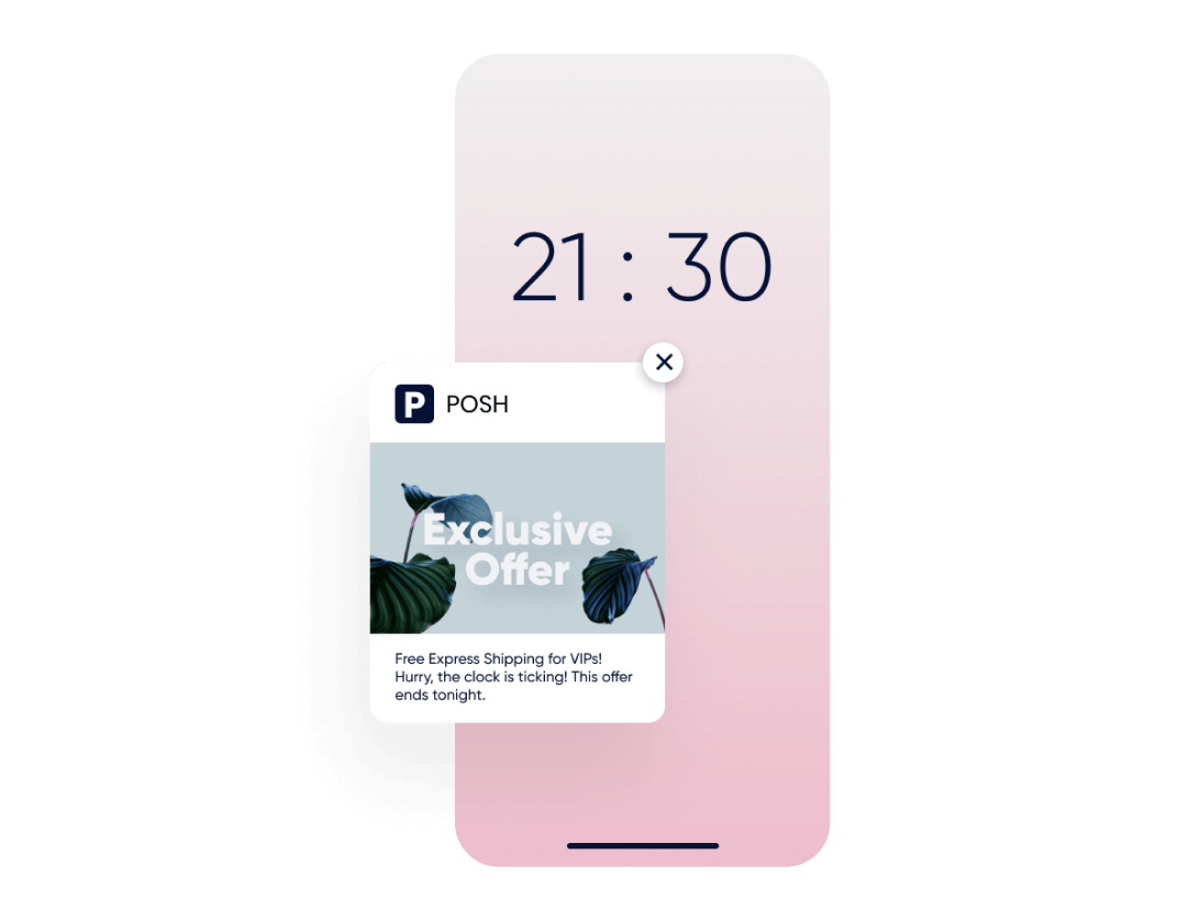 Les prédictions d'achat d'Insider ne se limitent pas aux publicités. Utilisez ces segments pour créer des landing pages personnalisées, des expériences web mobiles et des programmes de fidélité pour les VIP. Le taux de désabonnement vous rend-il fou ? Utilisez les prédictions d'achat pour conserver vos clients. Envoyez des notifications push web à vos clients avec des produits spéciaux, des abonnements et d'autres offres qu'ils ne pourront pas laisser passer ; vous verrez votre LTV grimper en flèche.