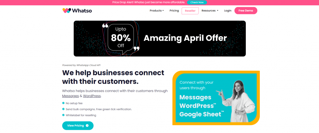 Whatso est une plateforme marketing axée sur WhatsApp et WordPress. Comme WATI, Whatso est une solution simple pour les petites entreprises avec des fonctionnalités de gestion des contacts, de protection anti-blocage des numéros de téléphone WhatsApp, de diffusion de messages (y compris aux formats texte et multimédia) et d’automatisation des chatbots.