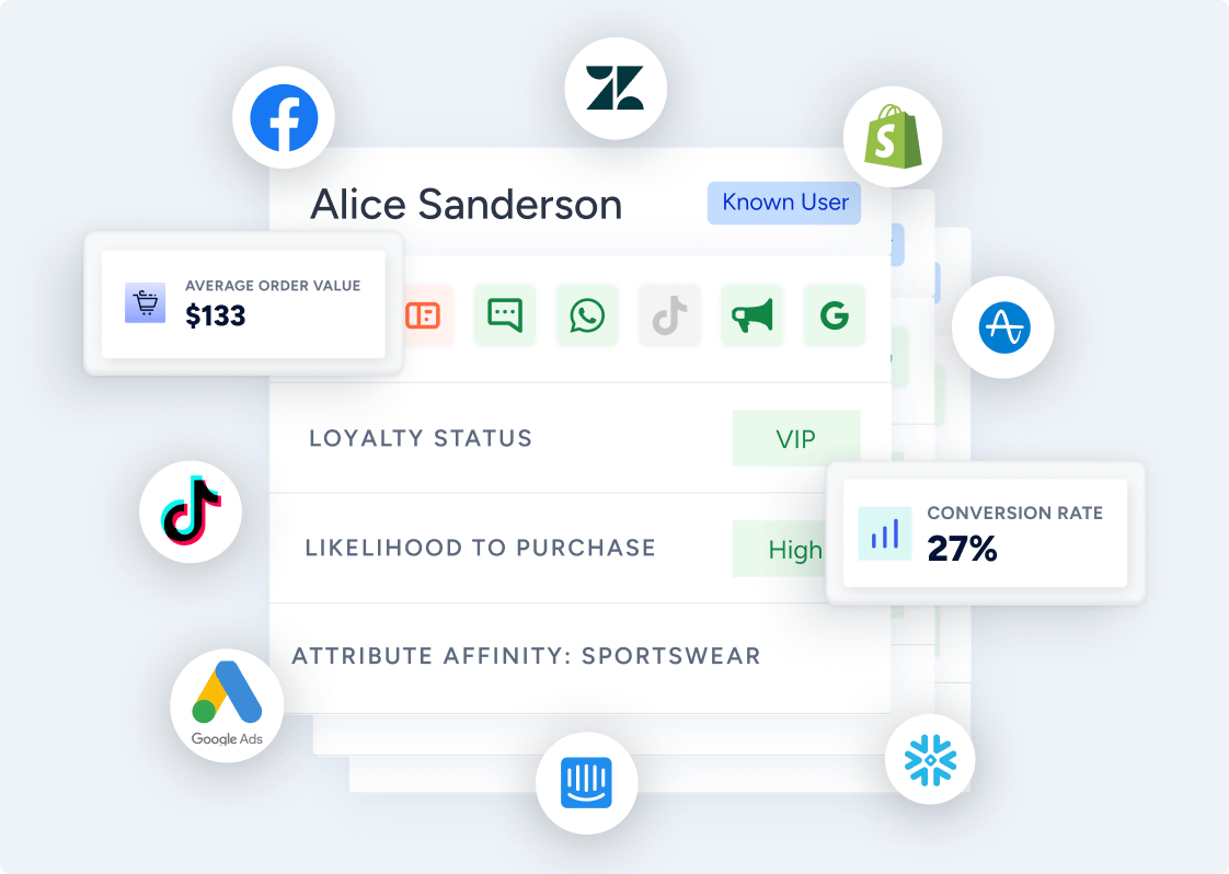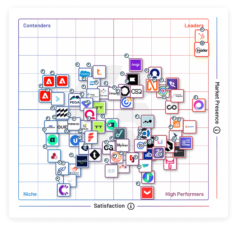Insider scored 99/100 for its Integration capabilities—10% higher than the industry average. Sync customer, engagement, and product data across your entire tech stack with 100+ out-of-the-box integrations in 20+ categories, including CRM, data warehouses analytics, paid ads, social media, and more.