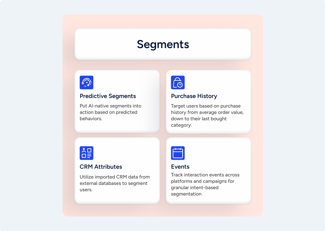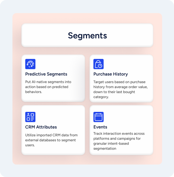 Identify, define, and target your audience with 120+ out-of-the-box filters and triggers, including traits, behaviors, preferences, and more. Create custom filters and triggers to suit your business needs and reach customers at the right time, on the right channel, with the right message-no IT support required.