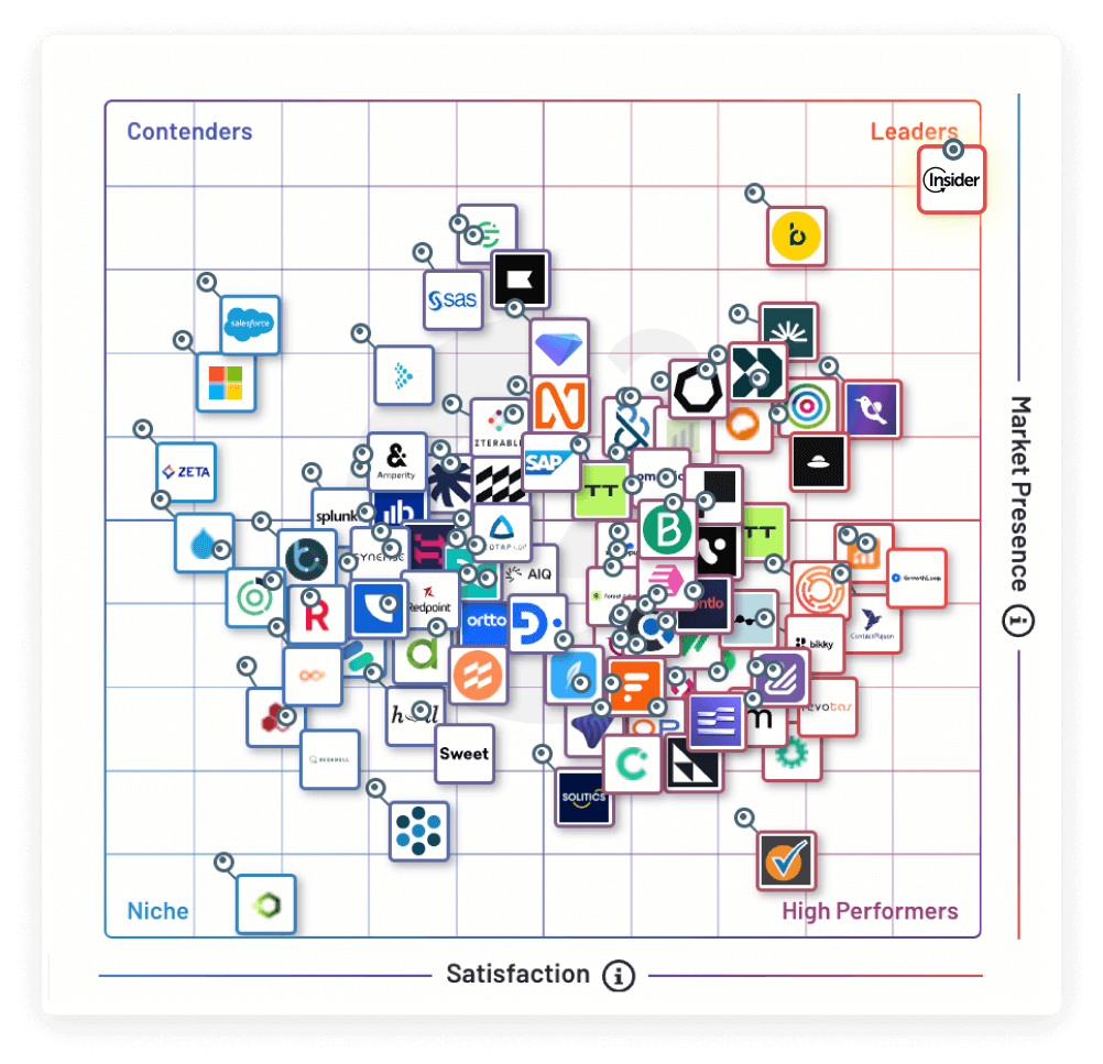 Insider scored 99/100 for its Integration capabilities—10% higher than the industry average. Sync customer, engagement, and product data across your entire tech stack with 100+ out-of-the-box integrations in 20+ categories, including CRM, data warehouses analytics, paid ads, social media, and more.