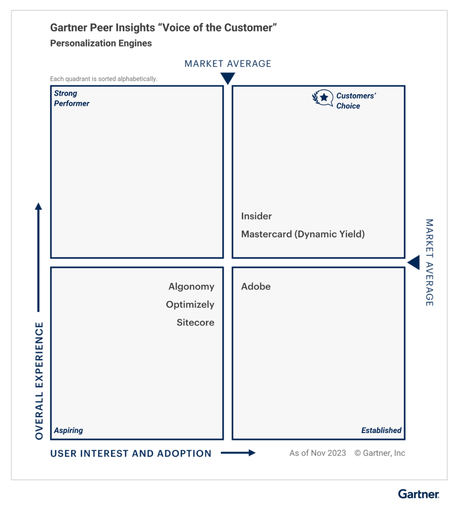 Gartner, Voice of the Customer for Personalization Engines, Peer Contributors, 29 December 2023. GARTNER is a registered trademark and service mark, and the GARTNER PEER INSIGHTS CUSTOMERS’ CHOICE badge and PEER INSIGHTS are trademarks and service marks, of Gartner, Inc. and/or its affiliates in the U.S. and internationally and are used herein with permission. All rights reserved. This graphic was published by Gartner, Inc. as part of a larger research document and should be evaluated in the context of the entire document. The Gartner document is available upon request from Insider. Gartner Peer Insights content consists of the opinions of individual end users based on their own experiences with the vendors listed on the platform, should not be construed as statements of fact, nor do they represent the views of Gartner or its affiliates. Gartner does not endorse any vendor, product or service depicted in this content nor makes any warranties, expressed or implied, with respect to this content, about its accuracy or completeness, including any warranties of merchantability or fitness for a particular purpose.