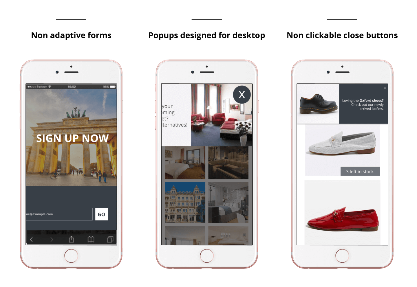 A great part of mobile pop-ups are originally set up for desktop and does not respond to all mobile screen sizes. Most mobile visitors are frustrated by being delivered pop-ups that are not relevant, not fully responsive or usable.