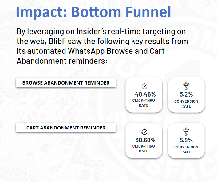 Blibli also addressed its browse and cart abandonment rates. With Insider One’s WhatsApp Business API solution, they sent personalized reminders and dynamic content to re-engage customers. The browse abandonment reminder campaign achieved a remarkable 3.2% CVR and an impressive 40.46% CTR.
