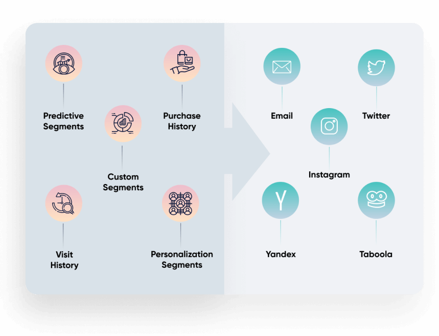 Create custom ad segments based on current and predicted user behaviors. Extend your brand reach by bringing ads to third-party channels like Google, Facebook, Twitter, and Yandex.