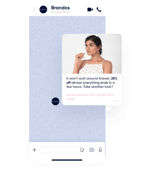 Start conversations where your customers are already active. Inspire cart abandoners to buy items they’ve left behind with messages and offers on WhatsApp and Facebook Messenger that create urgency and drive sales.