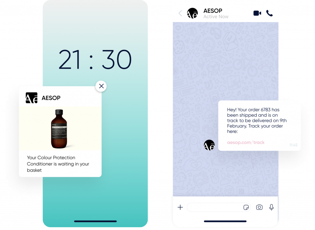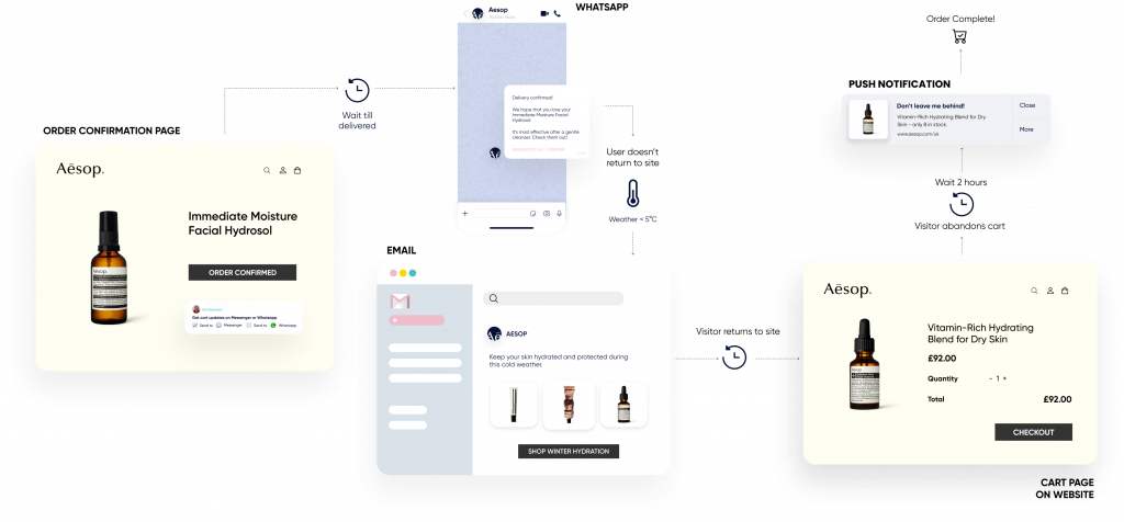 Utilise web push notifications, app push, WhatsApp, Facebook Messenger, Email, SMS and RCS