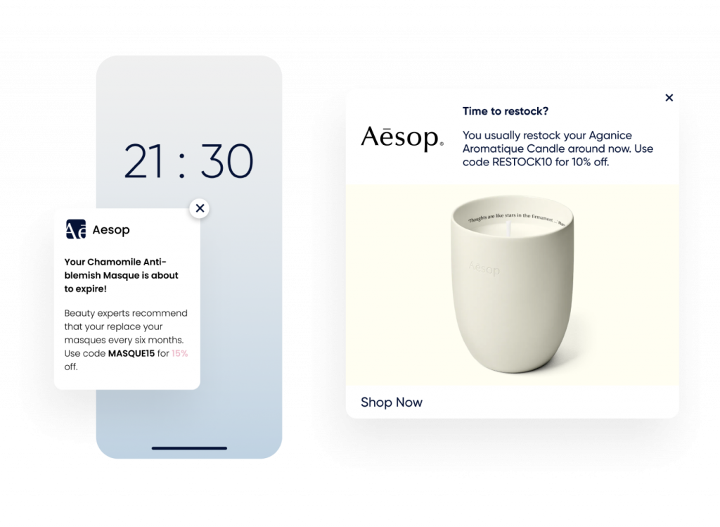 Send your customers replenishment reminders on and off-site to drive them back to your site, right before their favorite product is likely to run out.