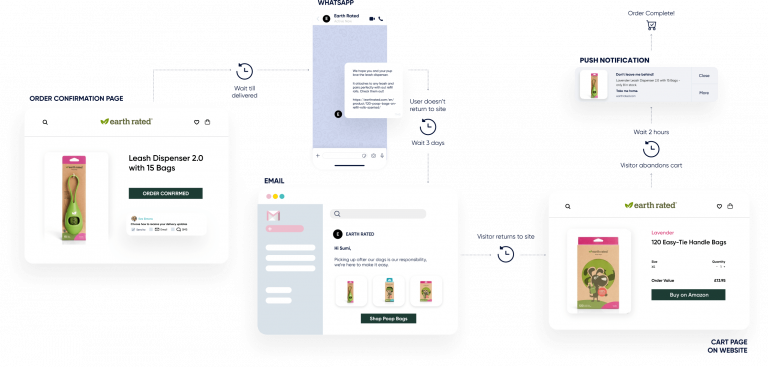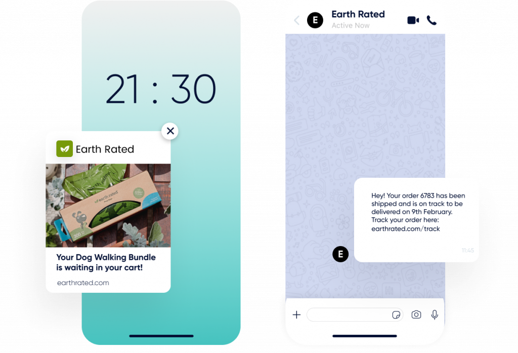 Utilize web push notifications, app push, WhatsApp, Facebook Messenger, Email, SMS and RCS.
