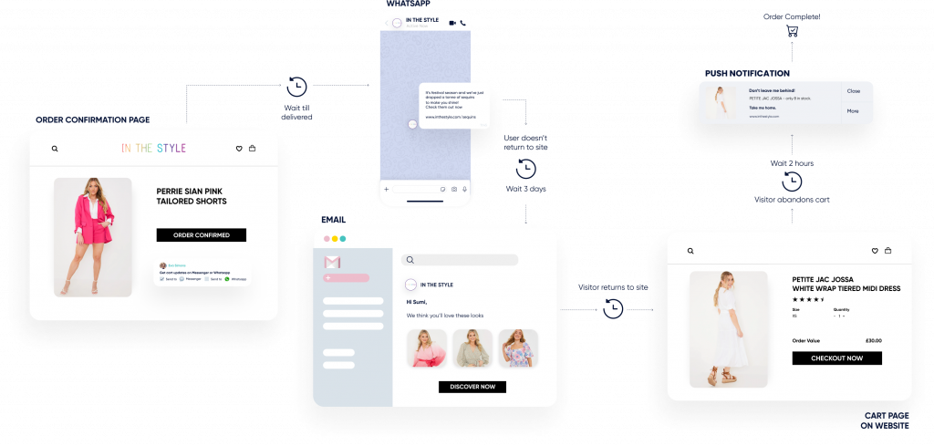 Utilise web push notifications, app push, WhatsApp, SMS, RCS in addition to traditional email.