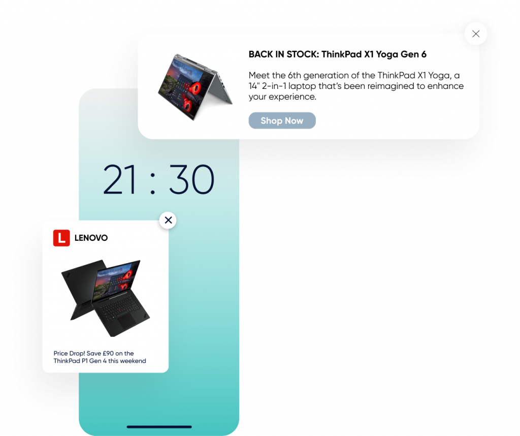 This fast-action channel can draw on data from your back-end systems to create triggered alerts. Notify users when a long awaited product comes back in stock or if a big ticket item they’ve been mulling over for a long time drops in price. In a single click, they’ll be taken straight back to site to make their purchase.