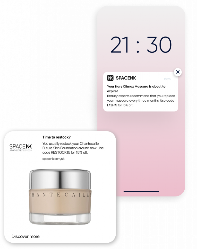 By combining makeup expiration data with customers’ purchase histories, you can send compelling reminders via web or app push to encourage them to buy and generate recurring revenue. Provide a discount to sweeten the deal.