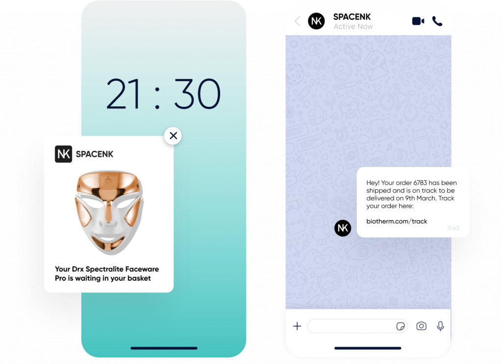Utilise web push notifications, app push, WhatsApp, Facebook Messenger, Email, SMS and RCS.