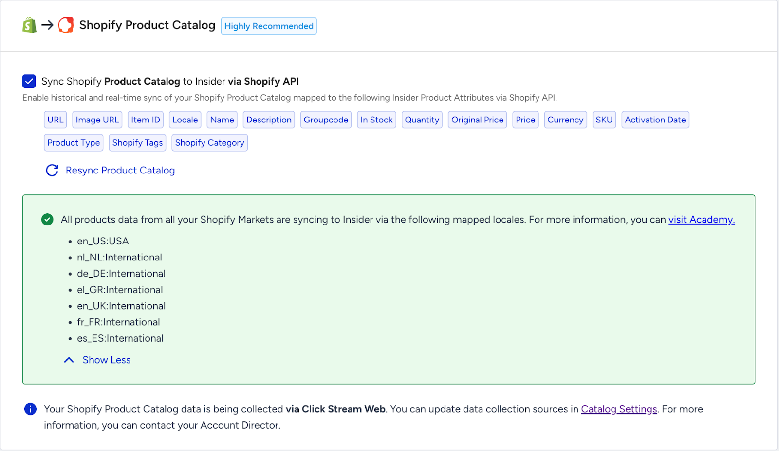 When Shopify Markets is connected, Insider One automatically creates market and locale-specific catalog structures based on the Shopify configuration. Each market and language combination is mapped consistently across products, users, and purchase data.