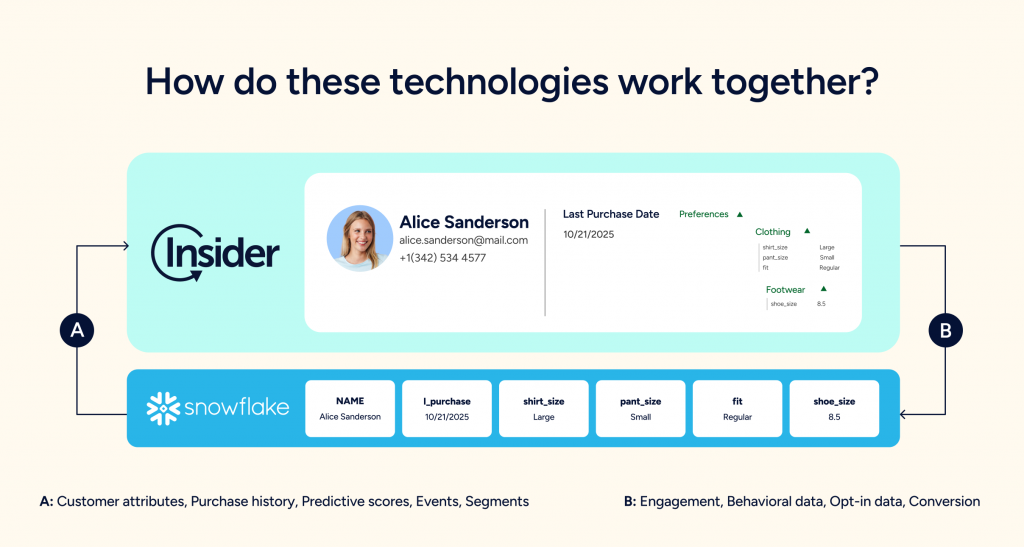 - Composable flexibility: Seamlessly connect Snowflake with Insider One’s activation layer without complex ETL or maintenance overhead.