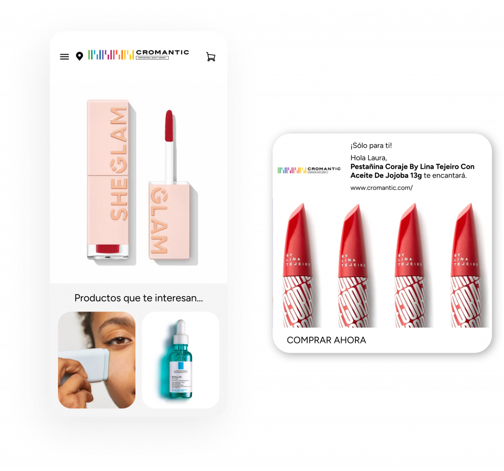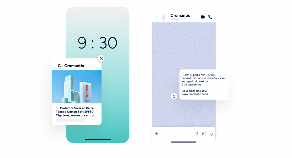Utiliza notificaciones Web Push, WhatsApp, Facebook Messenger, correo electrónico, SMS y RCS. Envía alertas automáticas y mensajes personalizados con recordatorios de carrito abandonado para acelerar las decisiones de compra y recuperar las ventas perdidas.