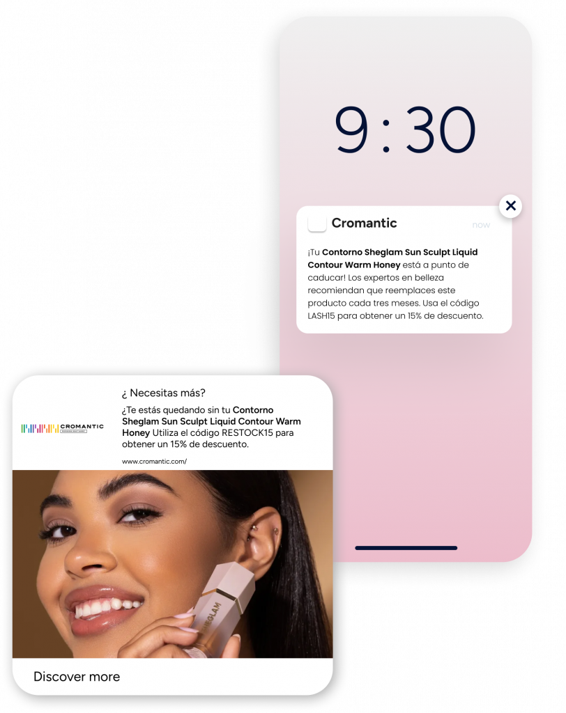 Combinando los datos de caducidad del maquillaje con los historiales de compra de los clientes, puedes enviar recordatorios atractivos a través de notificaciones push web o de aplicación para animarles a comprar y generar ingresos recurrentes. Ofrece un descuento para endulzar la oferta.